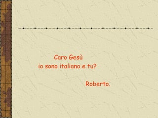 L'Unica Vera Lettera di N. S. Gesù Cristo La Vera Lettera L'Unica Vera Lettera di N. S. Gesù Cristo Delle Gocce di Sangue che N. S. Gesù Cristo sparse mentre andava al Calvario Copia di una lettera di Orazione, trovata nel Santo Sepolcro di Nostro Signore Gesù Cristo in Gerusalemme, conservata in una scatola d'argento da sua Santità e dagli Imperatori e Imperatrici della Fede Cristiana. Lettera di Gesù - WELCOME BRESCIA Il mio amore per te e più profondo dell oceano e più grande di qualsiesi desiderio o bisogno che ce nel tuo cuore. Ho se solo tu sapessi come vorrei parlarti e camminare con te,insieme potremmo consacrare un eternità nel cielo. So quanto e difficile vivere su questa terra,lo sa davvero. Lettera a Dio: come aprire il tuo cuore e scriverla Me lo hai insegnato tu Gesù che il sorriso e la bontà non tolgono nulla, danno tanto e ci ritornano sempre. E un po' come il cerchio magico delle storie che mi raccontava la mia mamma, quando ero piccola: io sorrido a te, tu sorridi a me e a un altro, e vedrai che alla fine ci sorrideremo tutti a vicenda. La 'Lettera di Gesù bambino' scritta a tutti quelli che lo ... Non voglio farvi paura ma dirvi la Verita' che vi rende Liberi in Me. Quanto e' importante per Me farti conoscere il mio Cuore e quant o Ti amo attendendo il Tuo Amore libero di immensa tenerezza. Però credimi, anche se hai poco o niente da offrirmi, lasciami entrare nel tuo cuore. Per me sarà il più bel dono che tu mi possa fare.