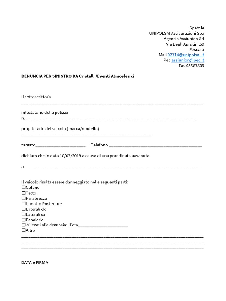 Lettera per assicurazione danni grandine. Poste Guidare Sicuri Descrizione La nuova offerta assicurativa RC Auto distribuita da Poste Insurance Broker S.r.l. per il tramite di Poste Italiane S.p.A. – Patrimonio BancoPosta che si compone di due prodotti realizzati rispettivamente da Linear Assicurazioni e Genertel S.p.a, dedicata all’auto e alla protezione dei familiari che la guidano. Cosa fare in caso di sinistro - Vittoria Assicurazioni Rivolgiti al tuo Agente Vittoria Assicurazioni. Saprà darti i migliori consigli su cosa fare. Ti ricordiamo che da Febbraio 2007 è entrata in vigore la procedura di risarcimento diretto che prevede che sia la tua assicurazione ad occuparsi del risarcimento dei danni in caso di sinistro, quando la ragione è dalla tua parte totalmente o parzialmente. EUR-Lex - 32014R0651 - EN - EUR-Lex - Europa I danni causati da condizioni meteorologiche avverse quali gelo, grandine, ghiaccio, pioggia o siccità non dovrebbero essere considerati una calamità naturale ai sensi dell'articolo 107, paragrafo 2, lettera b), del trattato. Per garantire che gli aiuti concessi per ovviare ai danni arrecati dalle calamità naturali rientrino di fatto nell ... Art. 1901 codice civile - Mancato pagamento del premio ... Apr 29, 2022 · Cass. civ. n. 23149/2014. In tema di assicurazione obbligatoria della responsabilità civile derivante dalla circolazione dei veicoli a motore, per le scadenze successive al pagamento del primo premio (o della relativa prima rata) di cui all'articolo 1901, secondo comma, cod. civ., l'effetto sospensivo dell'assicurazione per l'ipotesi di pagamento effettuato dopo il quindicesimo giorno dalla ...