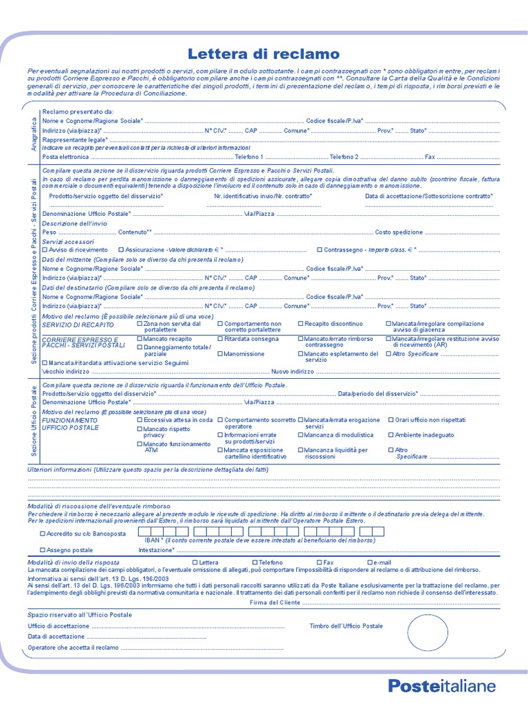 Modulo reclamo Poste Italiane: PDF per servizi postali Lettera di reclamo da inviare a Poste Italiane per formalizzare disservizi riguardanti servizi postali quali: recapito di corrispondenza, spedizione pacchi, ... Lettera di reclamo - Poste Italiane Compilare questa sezione se il disservizio riguarda prodotti Corriere Espresso e Pacchi o Servizi Postali. In caso di reclamo per perdita manomissione o ...